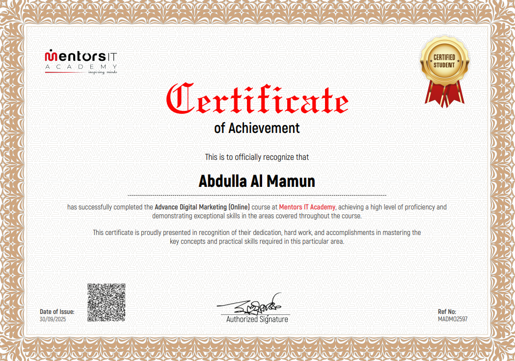 I successfully completed the Advance Digital Marketing (Online) program from Mentors IT Academy, where I developed high-level proficiency in SEO, branding strategies, and data-driven marketing techniques. This certification reflects my dedication, hard work, and practical expertise in mastering key digital marketing concepts.